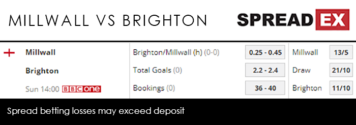 Wolves, one of the season’s biggest Premier League surprises, claimed a scalp early, knocking out Liverpool in the 3rd round. They’ve looked less convincing since then, however, requiring a replay against Shrewsbury, before narrowly getting past Bristol City. Saturday’s going to be tough, with Spreadex offering a Man United/Wolves (h) Goal Supremacy spread of 0.1-0.3. Finally, as the lowest ranked side left in the competition, Millwall will be aiming for an upset as they battle Brighton, at 2pm on BBC One. Flirting with Championship relegation, the Lions appear to have saved their best form for the FA Cup, beating Hull, Everton and Wimbledon en route to the quarter-finals.