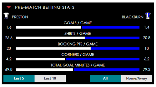 To see all the Preston v Blackburn betting stats and form, visit our pricing page to view our Pre-Match betting stats table or hover over/tap the chart image to see previous outcomes for that particular market.
